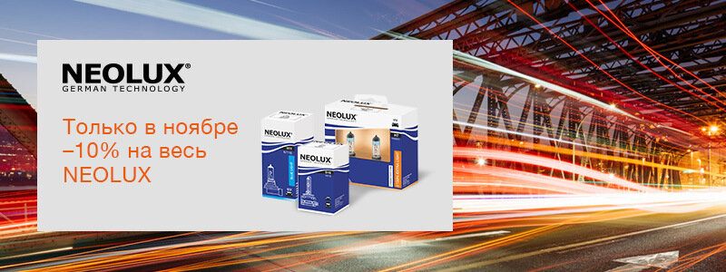 Марка автомобильных ламп NEOLUX – это надёжность немецкого бренда по доступной цене. Они соответствуют всем отраслевым стандартам и обеспечивают гарантированно-качественный свет. Вы спросите: в чём же разница с OSRAM? Отвечаем: OSRAM превосходит ожидания и стандарты. OSRAM – это те лампы, которые поставляются на заводы автопроизводителей, это премиальное качество и превосходные, топовые для рынка характеристики. Мы специально дополнили наше портфолио бюджетным брендом NEOLUX для тех автовладельцев, кто предпочитает разумный компромисс между характеристиками света и стоимостью автомобильных ламп. Весь ноябрь в нашем интернет-магазине скидка 10% на все лампы NEOLUX.
