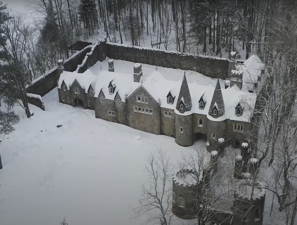 Зима уже совсем близко. А кое-где всё уже засыпано снегом. В этой лесной глуши спрятался замок, и сейчас он почему-то заброшен. Снаружи он похож на декоративную постройку, выполненную из муляжа для съёмок не то "Игры престолов", не то " Гарри Поттера". Однако подойдя ближе, убеждаешься в том, что это самый настоящий замок, просто новодел, построенный из современных материалов. Подходящий к стене замка кабель, висящая снаружи спутниковая тарелка, а также утыканные камерами стены, как бы намекают, что замок может быть обитаемый, и возможно даже он не заброшенный. Однако оконные проёмы без рам и рамы без стёкол окончательно убеждают нас, что там никого нет. Подходим ближе и машем руками на камеры в знак приветствия, а то мало ли. Если бы я был владельцем этого замка, и увидел, что к нему подходят какие-то люди с камерами, то наверное бы тоже не прилетел, разбираться, в чём собственно дело, и чего тут забыли незванные гости. Потому что люди, которые строят себе такие вот замки в труднодо