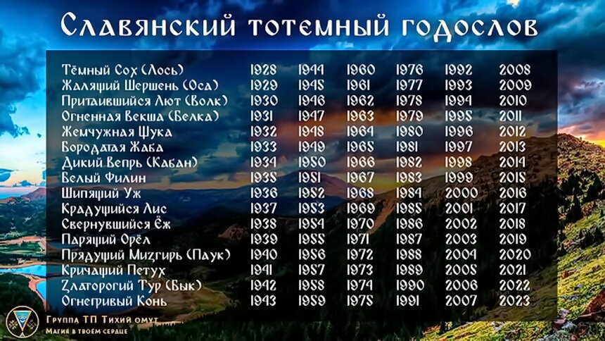 Отметим, что у славян год начинался с дня весеннего равноденствия, а именно с 21 марта, поэтому для рожденных с 1 января по 20 марта учитывается тотем предыдущего года.
