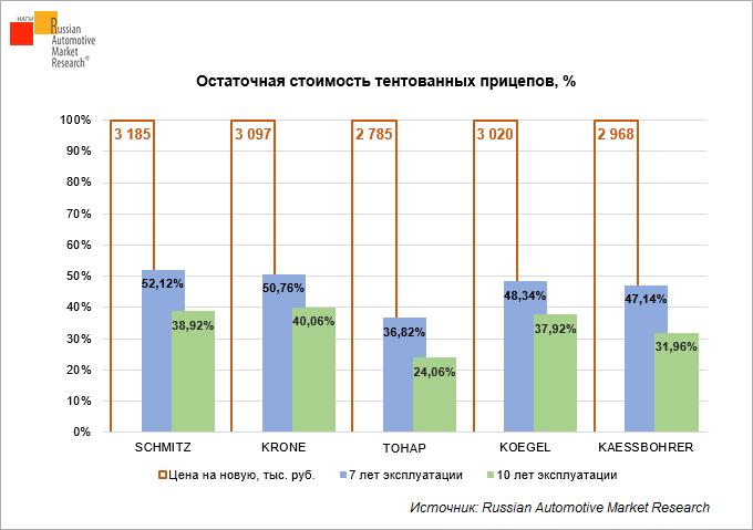 Через 10 лет эксплуатации лидером по сохранности остаточной стоимости является KRONE с результатом 40,06%.