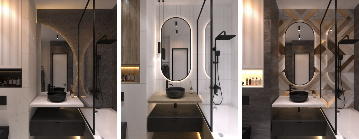 Третий вариант имеет общие схожие черты со вторым, но в качестве акцента применена плитка с объемной фактурой в зоне зеркала. Само зеркало имеет полукруглую форму, а встроенная подсветка подчеркивает не только изгиб самого зеркала, но и выступающие элементы на самой плитке, что в свою очередь привлекает наш взгляд.