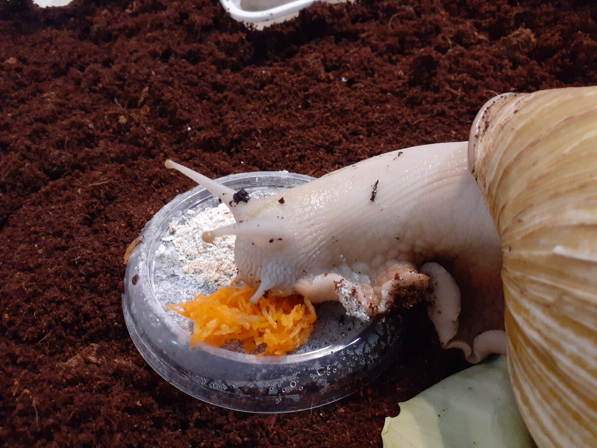 Давно не показывала улиток. Поменяла им подстилку, заодно и поснимала. Улитка ахатинка Помело. Возраст неизвестен. Домик улитки. Подстилка - мелкий кокосовый субстрат. Старую подстилку я с землей смешиваю, когда цветы пересаживаю. Или на клумбу выношу, под цветы подсыпаю. На клумбе земля плохая. Ракушка старая, поцарапанная, потому что улитку на улице нашли. Панцирь каракатицы (белая пластинка) - источник кальция для улитки. Погрызла "кальций" :) И повернула к кормушке. Улитка любит купаться, поэтому у нее дома "бассейн". А голыши на дне, чтобы бассейн не переворачивала. Улитка умеет передвигать кормушку. Заползает на нее, приподнимается с кормушкой вместе и сокращается. На фото видна вмятина на том месте, где кормушка была раньше. Вот улитка уже подвинула кормушку к себе :) Есть еще маленькая улитка Поедало. Домик у нее тоже маленький. Но Поедало такая шустрая! Глаз да глаз за ней нужен, а то убежит :))) К сожалению, летом умерла улитка ахатинка Уля, дочка Помело. Ей всего 2 года было