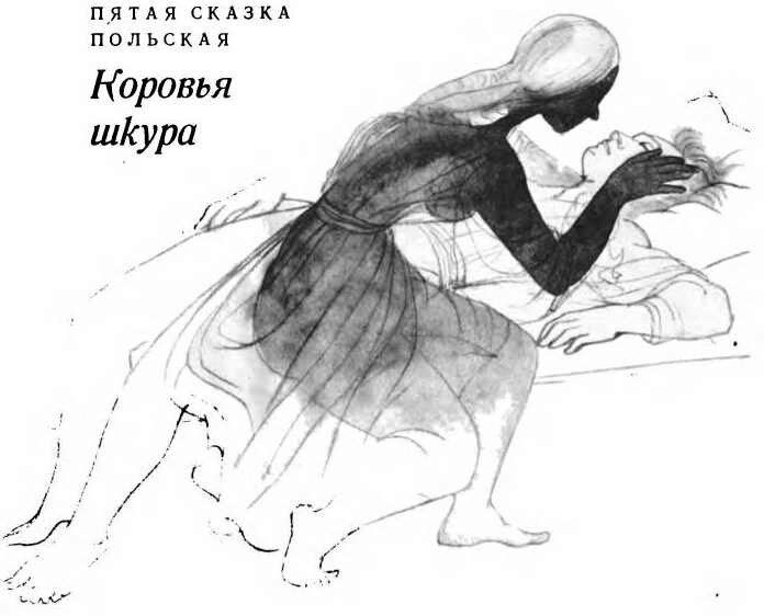 А вечером, когда стемнело, кто-то в коровьей шкуре подкрался к дому, вошел к сени и постучал в дверь. Открыла она — и отшатнулась в испуге, а коровья шкура запела: