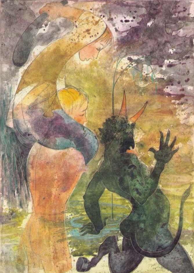 «Опять ты меня обманул!» — закричал Иван и погнался с жезлом за чертом. А тот опять принялся его упрашивать: