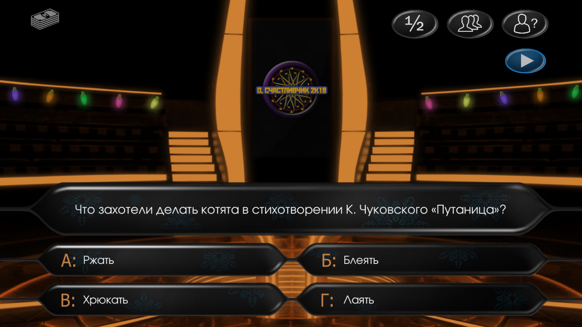 Так что же захотели делать котята в стихотворении К. Чуковского "Путаница"? Уже догадались, какой ответ является правильным? Даны варианты ответов: "Ржать", "Блеять", "Хрюкать", "Лаять". Правильный ответ – В (Хрюкать). Котята в стихотворении К. Чуковского «Путаница» захотели хрюкать. Здесь появляются скриншоты из игры для смартфонов "О счастливчик 2k19". Ссылка на скачивание игры: https://play.google.com/store/apps/details?id=com.onemillionairetrivia.m2K20. Друзья, это ссылка на последнюю версию игры. Игра "О счастливчик 2k19" недоступна в Google Play Market, зато она есть в App Store. На моем канале представлены скриншоты вопросов из игры "О счастливчик 2k19", а также развернутые ответы на эти вопросы. Сначала идет вопрос, затем - развернутый ответ на него. Добро пожаловать в интеллектуальный клуб. Друзья, буду рад, если вы присоединитесь к моему сообществу во "Вконтакте". Ссылку на сообщество можно будет увидеть в конце этой статьи. В моем сообществе во "Вконтакте" гораздо больше инф