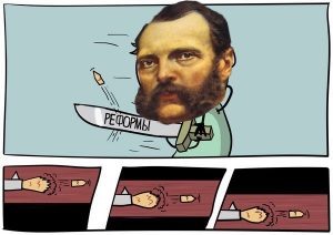 Александра Второго испортили западные идеи и восточные (ссыльные) декабристы, с которыми он во время путешествия по стране скорифанился в Сибири. Научили, короче, царя плохому. Шел 1861 год. - Свобода лучше, чем несвобода! Свободу всем – пусть думают, что хотят, и делают, что хотят! И крестьян – свободить! - О как. Царь-батюшка, и куда их, свободных? - Да куда хотят – хоть в поле пашут, хоть на заводах! - А земля? - Что земля? - Чья земля, на которой пахать? - Государственная, вестимо. - Значит, что напашут – нам отдавать? - Конечно! Ччерт!.. Но ведь сейчас так и есть… Фигня какая-то!.. Ломали головы вдвоем с премьер-министром в итоге все сломали – крепостное право, судебную систему и последние представления крестьян о том, в каком мире они живут. - Дык и че царь? - Дак, говорит, иди, куда хошь или деньгу гони! - Ой, беда какая – с земли сгоняют, да будь она трижды проклята, воля царская!.. Камикадзе, отморозок и революционер Сергей Нечаев: - Довели трудовой народ, кровопийцы! А ну кон