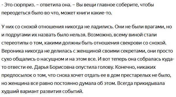 – Доброе утро, Дарья Борисовна. - Вероника зашла в комнату пожилой женщины, своей свекрови. - У меня для вас новость. Вам надо собрать вещи, сегодня поедем кое-куда. – Интересно. А куда? - почему-то женщина запаниковала.