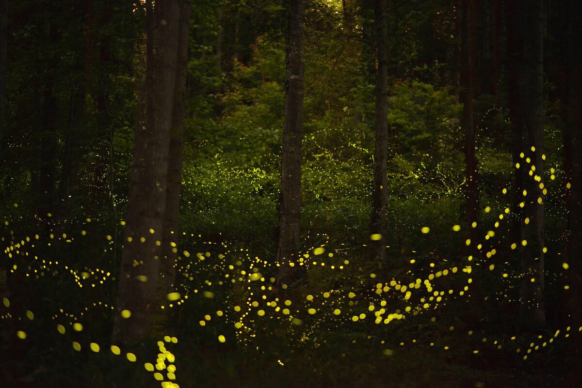 Наступила ночь, на лес опустилась темнота. С неба светили звездочки и бледная луна. Все лесные жители уже спят и видят красочные сны. Только Желтому Полосатику не спится. Он так набегался и налетался за день, что у него гудят ножки и болят крылышки. Шмель выглянул в окошко и увидел светящиеся точки на небе, но это была привычная для него картина. В траве блестели и переливались какие-то шарики. Вот это было чем-то новым для шмеля, он никогда до этого не видел ничего подобного. Ведь обычно он крепко спал в это время. Желтый Полосатик вышел из дома и подошел к одному из светящихся шариков: - Эй, привет. Ты кто? - Я светлячок, меня зовут Блестящий Бочок. Почему ты не спишь, Желтый Полосатик? - Откуда ты знаешь, как меня зовут? - Я иногда заглядываю в твое окно и вижу, как ты спишь. А перед сном к тебе приходит мама и желает приятных снов и называет твое имя, конечно. - А почему ты сам не спишь ночью, Блестящий Бочок? - Я всегда сплю только днем. Я же не шмель. Желтый Полосатик внимательно