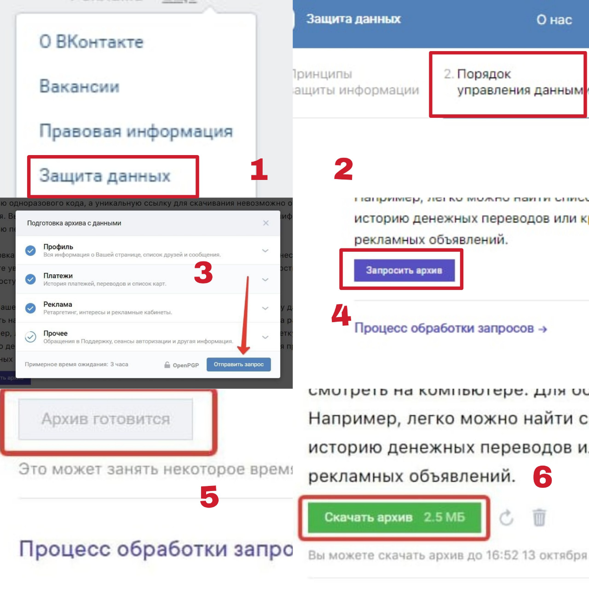 ВК позволяет скачивать архив со своими данными: файлами, фото, сообщениями и другими. За какой период — неизвестно, потому что функцию только тестируют. У кого-то хранятся переписки двухлетней давности, у кого-то только месячной. Как запросить архив: 1. В боковом меню нажмите на кнопку "Ещё". Она находится ниже основных кнопок и блока рекламы. 2. Затем нажмите на кнопку "Защита данных". 3. В блоке, где перечислены различные пункты по защите данных, нажмите на "Порядок управления данными". 4. В самом конце страницы нажмите "Запросить архив" . 5. В меню "Подготовка архива с данными" отметьте те пункты, которые вам нужны. 6. Затем нажмите кнопку "Отправить запрос". Архив готовится от нескольких часов до двух дней. Как только он будет готов, вы получите сообщение и ссылку, по которой его можно скачать на компьютер или смартфон.