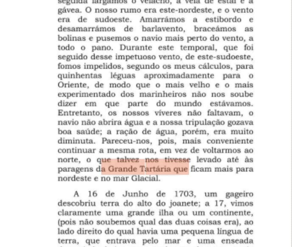 Приключения Гулливера, написанные Свифтом, были порядком подредактированы первым издателем А. Мотом за их "откровенный и шокирующий характер", но если опустить эротические моменты книги, то в ней находится удивительное свидетельство моряков. Путешествие в Бробдингнег (Страну Великанов) содержит такие строки: Глава 1: "...Мы сочли за лучшее держаться прежнего направления, нежели отклоняться более к северу, так как при этом нас могли унести в северо-западные области Великой Татарии или к Ледовитому морю. Шестнадцатого июня 1703 года стоявший на стеньге юнга увидел землю..". В оригинале же, название страны, разумеется, Grande Tartaria. А может, страна Великанов не такая и выдуманная?