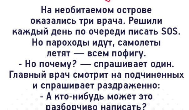 САМЫЕ СМЕШНЫЕ АНЕКДОТЫ ЗА ДЕНЬ! ************* Еврей отличился в русско-японской войне. Он может выбрать награду: георгиевский крест или сто рублей. — Какая цена георгиевского креста? — спрашивает он. — Бессмысленный вопрос, — отвечает офицер, сам крест стоит не больше рубля. Здесь речь о чести. — Понимаю, — говорит еврей, дайте мне 99 рублей и крест. ************ Предлагаю власти поступить с принудительной вакцинацией как с переписью населения: пусть посчитают, что привито 100% населения, доложат об этом Путину, и уже от......ся от нас. ************ *********** Роспотребнадзор: эпидемия ковида может быть остановлена только, когда уровень коллективного иммунитета превысит средний IQ депутата Госдумы. +++++++++++ ************* Сказка