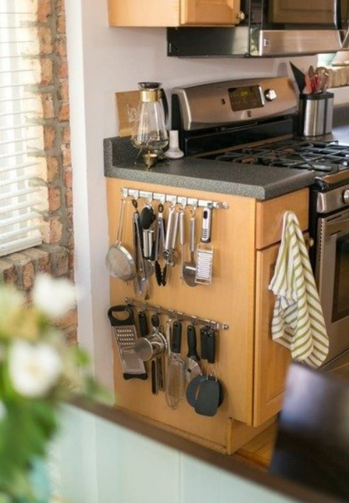 Старайтесь задействовать боковые поверхности шкафчиков, когда это возможно. Их можно оборудовать легкими полками или крючками