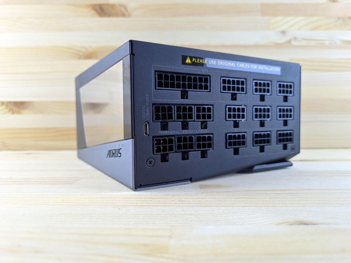 Модель носит полное название AORUS P1200W 80+ PLATINUM MODULAR, а сокращённо – GP-AP1200PM. Собственно, в этом наборе букв и цифр зашифровано то, что его максимальная мощность составляет 1200 Ватт, он получил платиновый сертификат по программе эффективности 80 Plus и имеет модульную конструкцию, позволяющую подключать только необходимые кабели.