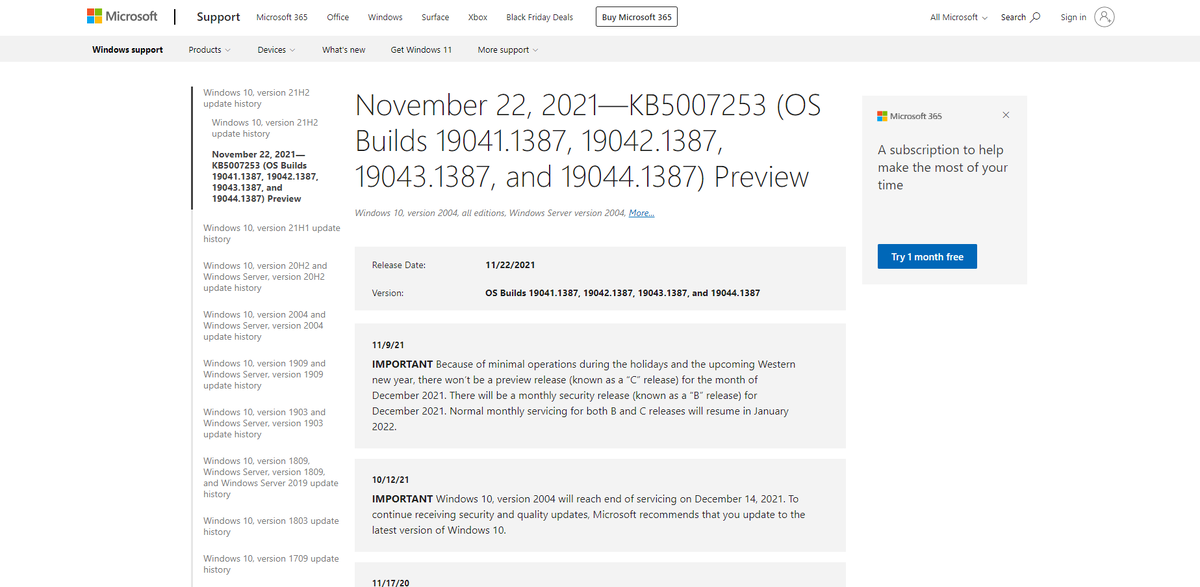 Майкрософт напоминает, что 14 декабря 2021-го года закончится поддержка функционального обновления "Майское обновление 2020" ("Windows 10 May 2020 Update", 2004), после чего устройства, на которых оно установлено, больше не будут получать ежемесячные накопительные обновления с исправлениями ошибок и ошибок безопасности. Данным пользователям рекомендуется перейти на более новое функциональное обновление Windows 10: "Октябрьское обновление 2020" ("Windows 10 October 2020 Update", 20H2), "Майское обновление 2021" ("Windows 10 May 2021 Update", 21H1), и "Ноябрьское обновление 2021" ("Windows 10 November 2021 Update", 21H2). Либо перейти на Windows 11, если устройство соответствует всем системным требованиям Windows 11.