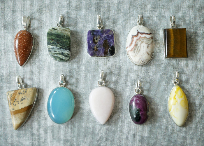 Камни: бирюза, аметист, гранат, сапфир, топаз, хризолит, лазурит, гиацинт, турмалин, обсидиан, тигровый глаз, циркон, рубин, нефрит, сардоникс, селенит, оникс, топаз, чароит, янтарь.