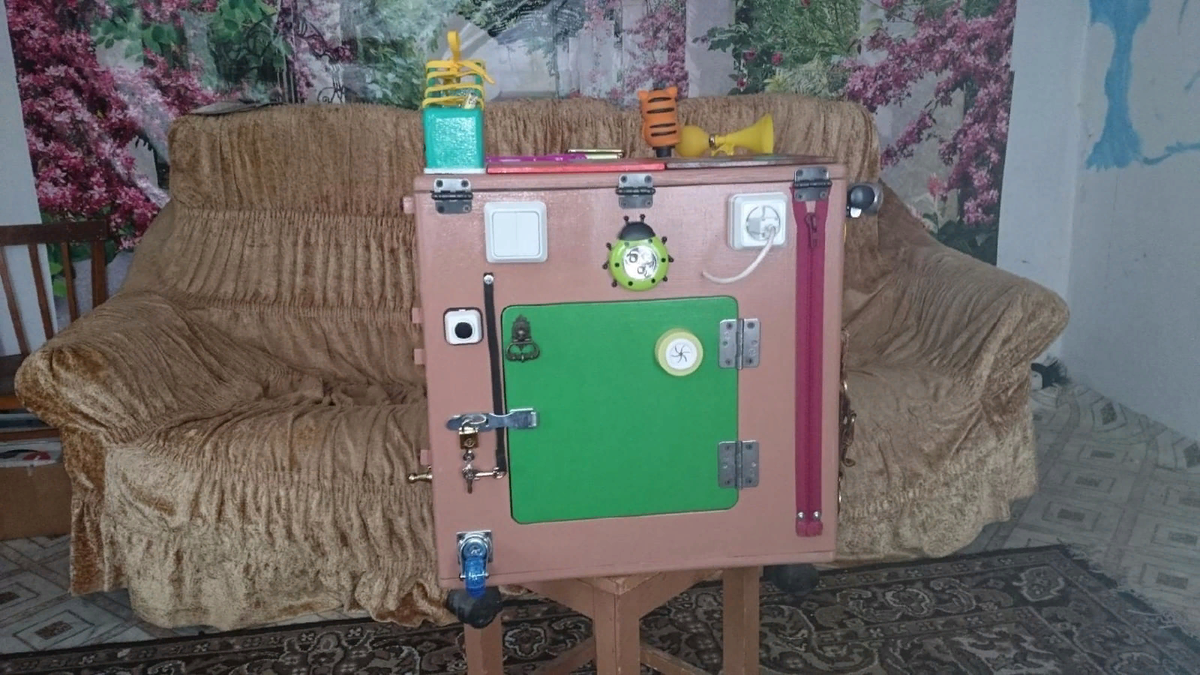Здравствуйте мои дорогие подписчики и гости! Сегодня я хочу показать вам какой бизибокс мы с мужем сделали для внука на годик. Может кому-то понравится и он порадует своих внучат, ведь такой куб можно сделать как внуку так и внучке, главное чтобы в доме нашлось место для него. А уж внуки оценят его, уж поверьте мне на слово. Основная работа пришлась, конечно, на мужа, это он у нас виртуоз работать с лобзиком. Из фанеры, толщиной 20 мм, выпилил 6 квадратов 50х50, обшкурил все стороны и торцы, потом закрепил на уголки внутри, а крышку сделал откидную, на шарнирах, не беспокойтесь, крышка тяжелая и малыш ее открыть или даже поднять не сможет. Снизу прикрутил мебельные колесики, так что с уборкой тоже все в порядке, откатил и убрался. Потом пришёл мой черед, я покрасила весь этот ящик и внутри тоже.
