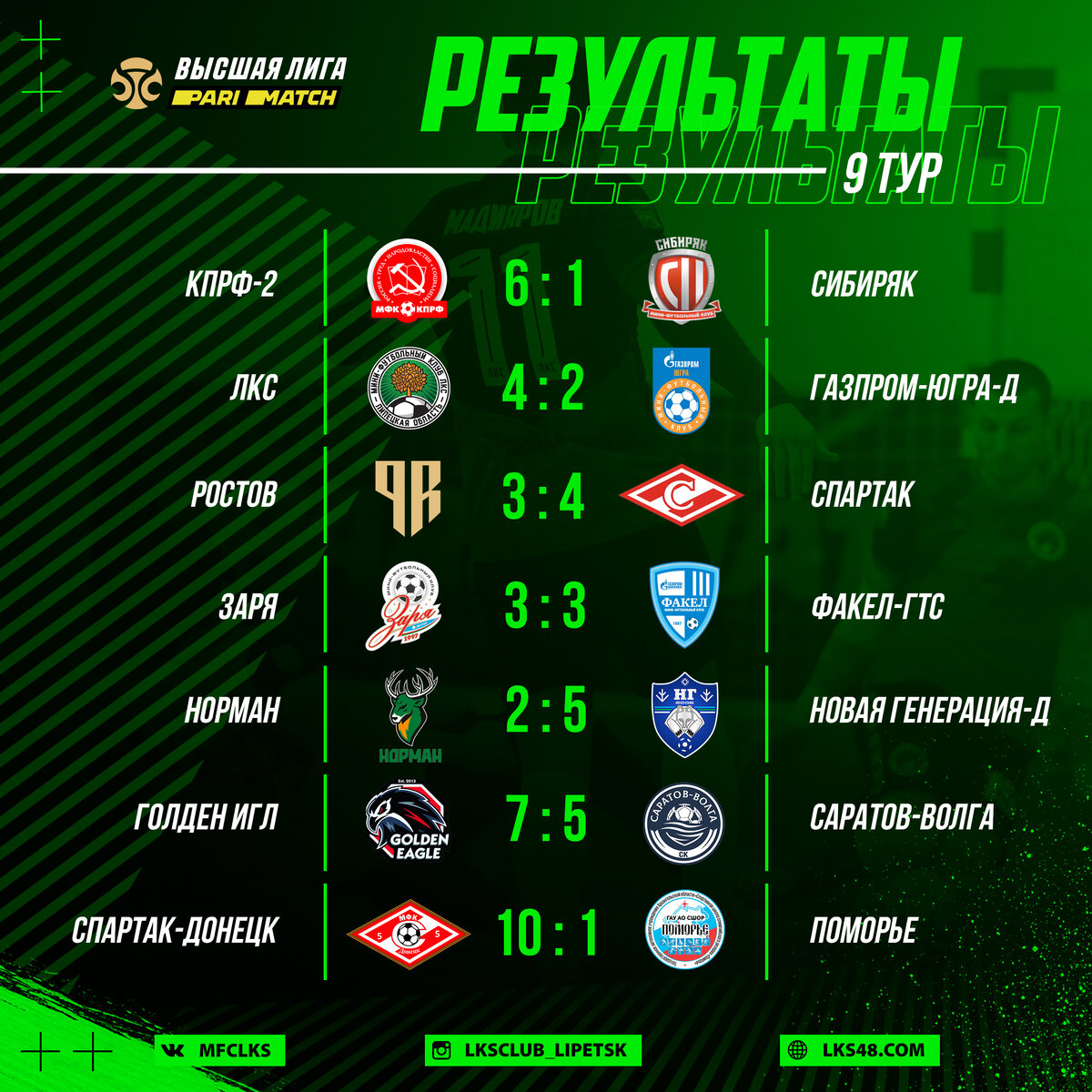 МФК "Спартак-Донецк" (Ростовская область) - МФК "Поморье" (Архангельская область) - 10:1. Турнирную таблицу после 9-го тура вы можете посмотреть на сайте мини-футбольного клуба ЛКС. Ближайший матч МФК ЛКС проведёт в Сургуте, где 27 ноября встретится с местным "Факелом-ГТС".