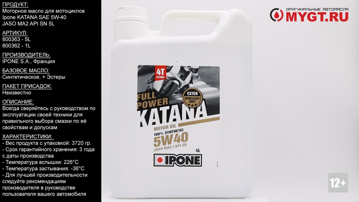 Продукт: Моторное масло для мотоциклов Ipone KATANA SAE 5W-40 JASO MA2 API SN 5L Наш телефон: 8-800-550-57-22 ПН-ПТ 9.00-17.00 (МСК+4) Артикул: 800363 - 5L 800362 - 1L Производитель: IPONE S.A., Франция Базовое масло: Синтетическое, + Эстеры. Пакет присадок: Неизвестно Ссылка для покупки: https://mygt.ru/oil/ Вы предпочитаете спортивный стиль езды, ищете острых ощущений? Это масло для Вас. Моторное масло высшего качества, разработано для мотоциклов с двигателями большого объема с интегрированной коробкой передач. Подходит как для спортивного так и повседневного использования. Преимущества: ● Полностью синтетическое моторное масло на основе сложных эфиров, что обеспечивает стабильность свойств масла во всех режимах. ● Образует высокопрочную масляную пленку, значительно продлевая срок службы трущихся деталей. ● В состав входит модификатор избыточного давления, обеспечивающий превосходную работу коробки передач и трансмиссии. ● Разработано для экстремальных нагрузок