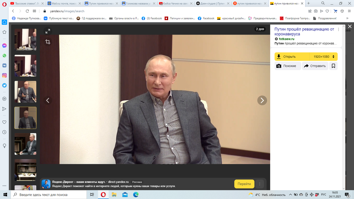 первоисточник https://news.mail.ru/society/48924897/?frommail=1 МОСКВА, 24 ноя — РИА Новости. Владимир Путин на совещании с членами правительства сообщил, что привился назальной вакциной от коронавируса. Президент уточнил, что после процедуры никаких неприятных ощущений у него не было. Кроме того, глава государства рассказал, что 22 ноября ревакцинировался «Спутником Лайт». «Ровно через шесть месяцев после вакцинации у меня титры защитные опустились, и специалисты порекомендовали провести процедуру ревакцинации, что я и сделал», — пояснил Путин. О своем желании стать добровольцем при испытаниях новой назальной вакцины президент сообщил на встрече с замдиректора Центра эпидемиологии и микробиологии имени Гамалеи Денисом Логуновым 22 ноября. Без Комментариев.......