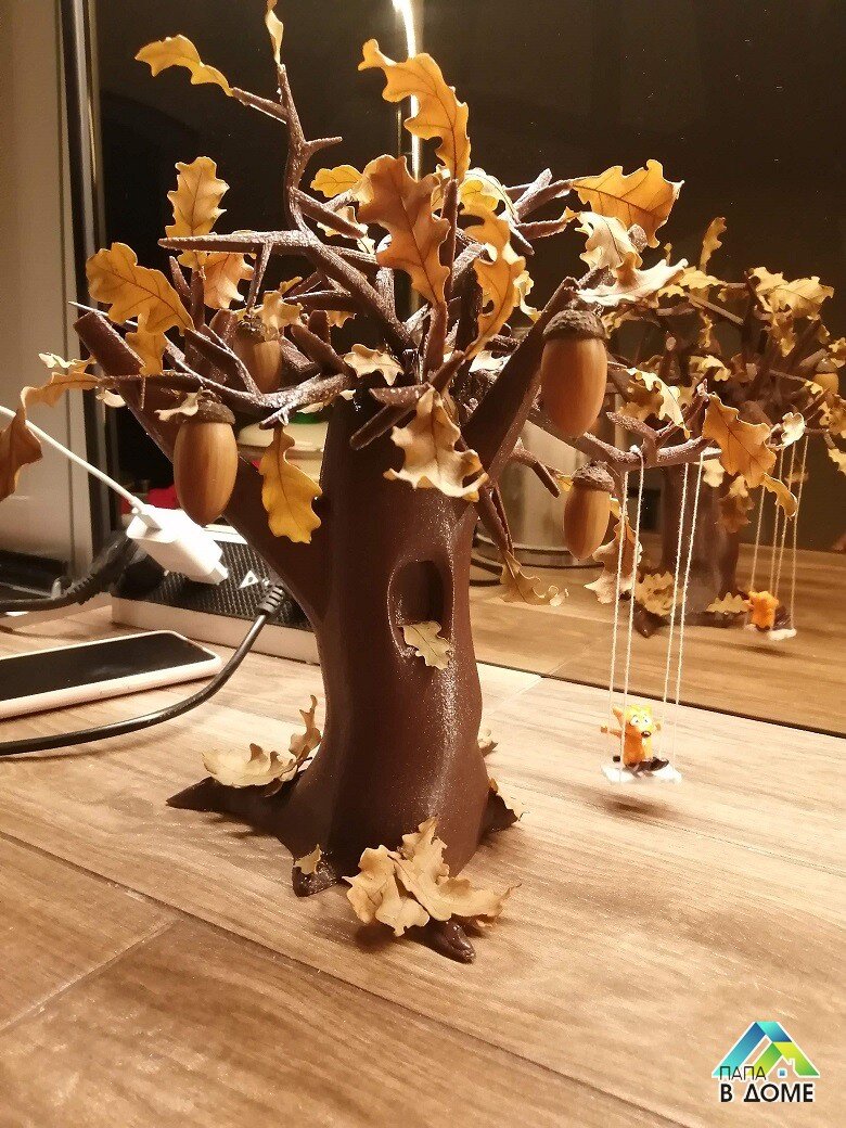 Осень наступила, всюду листопад. И дали нам задание, придумать поделку в сад на тему осени. И папа не был бы волшебником, если бы у него не пылился на столе принтер, печатающий пластиком. Тут, конечно, есть свои сложности, ведь принтер не умеет печатать сам, ему нельзя сказать словами или показать на пальцах. Люди, когда узнают о такой штуке, почему-то не думают об этом. Им кажется, что это зверь-машина, которая може вообще всё. Нет, она может ровно столько, сколько умеет пользователь программы, в которой создает модель. Но в целом сделать можно очень многое. В огороде мы садили дуб, но он еще совсем маленький и листья у него тоже мелкие. А от родителя этого дуба есть жёлуди. В общем, материал имеется, поэтому решили делать именно осенний дуб. Осталось только придумать ствол с ветками. Он нашелся в закромах "интернетовских" уже готовый (да простят меня воспитатели), увеличил только размер, а вот ветки пришлось рисовать-моделировать, а после печати ещё греть и загибать в разные стороны.