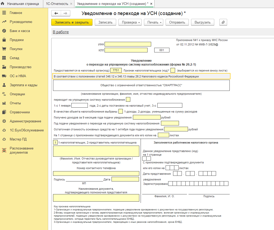 Чтобы вашей компании или индивидуальному предпринимателю перейти на упрощенную систему (УСН) необходимо подать соответствующее Уведомление в налоговый орган по месту вашей постановки через оператора АО "Калуга Астрал" (1 С Отчетность) в 1С Бухгалтерия 8.3 Далее по полям (желтого цвета) краткие комментарии (сверху вниз, слева направо): поле "Предоставляется в налоговый орган (код)": (нужно выбрать из списка, как правило, это налоговая инспекция, в которой вы стоите на учете); поле "Признак налогоплательщика (код)": в зависимости от вашей ситуации возможны три варианта: поле "Переходит на упрощенную систему налогообложения" (возможны три варианта): поле "В качестве объекта налогообложения выбраны" (возможны 2 варианта): 1) Доход 2) Доходы, уменьшенные на расходы поле "Получено доходов за 9 месяцев года подачи уведомления": укажите сумму доходов, которую заработали с 01.01.xxxx по 30.09.xxxx (или укажите ноль); поле "Год подачи уведомления о переходе на упрощенную систему налогоо