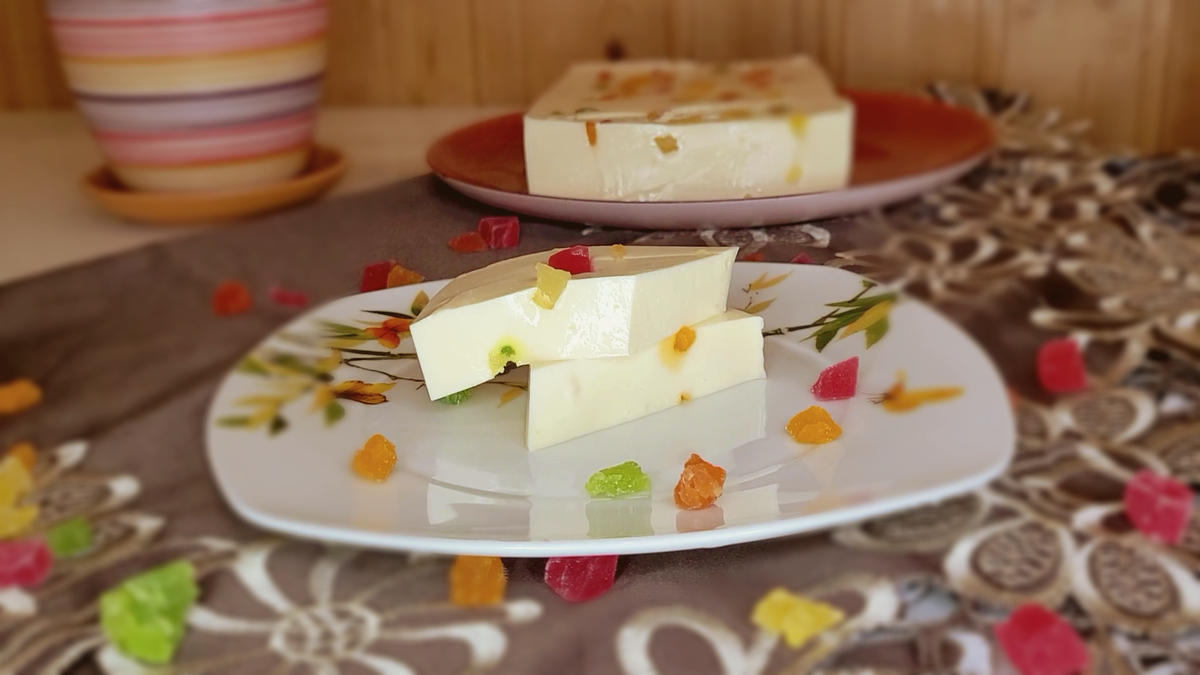 Всем привет! Хочу с вами поделиться очень вкусным и лёгким десертом который готовится без духовки. Готовится очень быстро, а вкус понравится каждому кто его попробует. Десерт без теста и на приготовление понадобиться около 10 минут. Ингредиенты: Приступим к приготовлению! Заливаем желатин частью холодного молока (100 мл) перемешиваем и оставляем до набухания желатина. Желтки соединяем с сахаром и перетираем. Вливаем оставшиеся молоко все перемешиваем. Ставим кастрюлю на плиту на средний огонь постоянно помешивая массу доводим до кипения, чтобы смесь загустела. Как только начнёт кипеть, то можно снимать с плиты. В горячую массу добавляем желатин и всё перемешиваем до полного растворения желатина. Масса должна получиться однородной. Добавляем сметану с ванильным сахаром к остывший яичной смеси и с помощью венчика перемешиваем до однородной консистенции. Заливаем мусс в силиконовую форму и посыпаем сверху цукатами, затягиваем пищевой плёнкой чтоб он не обветрился. Убираем в холодильник