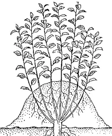 С помощью отводков можно сохранить целый ряд плодовых и декоративных растений. Например,крыжовник, смородину красную и черную, жимолость,виноград, иргу, лещину, лимонник, калину, можно сохранить сорт и обновить плодовое растение. Не только плодовые кустарники, но и плодовые деревья размножаются и обновляются таким способом. Существует несколько видов отводков. Дуговидные, горизонтальные, вертикальные, воздушные, верхушечные. Все они схожи в том, что укореняются без отделения от основного растения. 1 Дуговидные В небольшую ямку (8-12 см) около растения я укладываю однолетнюю или двулетнюю ветку, которая дуговидно изгибается, фиксирую ее в таком положении колышком с крючком либо проволочной «птичкой - шпилькой» ^ вот такого вида. Макушку ветви я привязываю длинной веревкой к кусту, либо к колышку чтобы она росла вверх. Ямка с частью побега засыпается так чтобы образовался холмик земли. Так можно уложить несколько ветвей и оставить до осени или до весны. В месте изгиба вырастаю