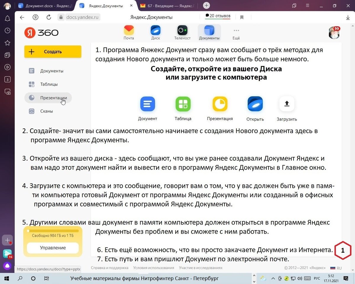 У Яндекс Почты есть программа Яндекс Диск и есть программа Яндекс Документы и один из официальных типов документов - это Презентация. Сегодня у нас СТАРТ или Урок номер 1 один и мы просто изучаем самое первое начальное окно программы. Начинаем изучать программу с самого начала и это наш первый вход в программу Презентация. Презентация - это самый многозадачный документ Яндекса и так же в офисных документах. В документ Презентация можно включать, можно сказать буквально всё, что вы хотите вложить в этот документ офиса. Вставить можно в документ Презентация: текст, рисунки, фотографии, картинки, музыку или музыкальные файлы, фильмы, видеоклипы, кино,