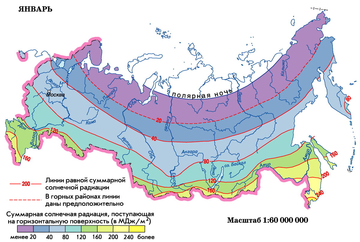 Некоторые думают, что на Северном полюсе панельки не будут работать, в том смысле что для них там мало света. А лучше всего будут работать на экваторе. И даже приводят вот такую карту инсоляции России, где видно что инсоляция зимой только в пределах России отличается в более чем 20 раз, что уж говорить про экватор)) Но уже на годовой карте видно что инсоляция различается всего в 2 раза. Если же взять расчет на основе данных НАСА, то получается, что с одинаковой панели (1 кВт) в разных местах (при оптимальном для каждого места углом наклона солнечной панели) можно получить следующее количество кВтч в сутки в среднем по году: Видно что среднегодовая выработка в Сочи всего на 16/12=33% лучше чем на Северном полюсе!))
