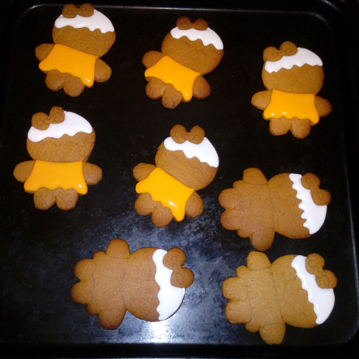 Ну вот и настала пора печь новогодние пряники. Первыми на очереди стоят, конечно, пряничные человечки. Будут у меня мальчишки и девчонки. Как всегда: сначала тесто и заготовки-болванки. Кстати, вкусные сами по себе, без какого- либо вмешательства глазури. После выпечки начинается кропотливый, медленный, но при этом такой медитационный этап раскраски. Как видно по фото: "девчонкам" делаем причёску (пусть будут блондинки), наряжаем в яркий сарафан. Контент 18+ (пока нагишом) Теперь в приличном виде. Добавим аксессуаров в виде банта, дорисуем "ножки-ручки". Ну какая же девочка и без макияжа? Этого мало - сделаем поярче акцент на глаза (как сейчас принято-нарастим ресницы). Целое бабье царство. Настал черёд мальчиков. С ними проще: раз-два и одела, никаких причёсок и макияжа. Главное, как завещали ещё наши бабушки: шапку надеть и тёплый шарф. Взгляд сделаем осмысленным, живым и умным. Мальчишка хоть куда. А вот и новогодние хороводы "понеслись". А кто-то себе и пару на Новый Год нашёл. Пр