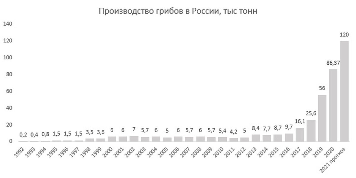 https://genby.livejournal.com/954382.html В Советской России грибов не выращивали. В 1992 году грибное производство составило 200 тонн. К 2000 году производство грибов выросло в 30 раз. Но без государственной поддержки, производство остановило рост.
