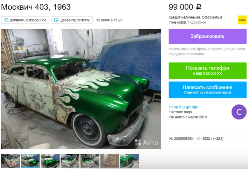 Сегодня, выйдя на улицу можно увидеть массу различных моделей автомобилей, но все чаще современных. Ретро автомобили на проезжей части встречаются довольно редко. Чаще всего их используют в качестве авто для свадебных торжеств. Но все же, не смотря на то, что многие стремятся приобрести машину современную, спрос на ретро автомобили существует. Так, сегодня такое авто можно приобрести достаточно просто, причем цена на него не будет слишком высокой. Правда, иногда приобретая ретро-автомобиль, можно приобрести еще и много проблем связанных с ремонтом. Итак, рассмотрим несколько автомобилей в продаже, которые можно условно отнести к ретро, так как кузов некоторых из них существенно видоизменен. 1. Москвич – 403, цена 99 000 рублей «Чоп-топ», именно так обозначается видоизменение этого авто. Создано оно для того, что бы понизить крышу. Такая крыша очень привлекает владельца авто, он является ярым фанатом «Чоп-топа». Странно то, что именно москвич был выбран для этого преображения. Хозяин уп