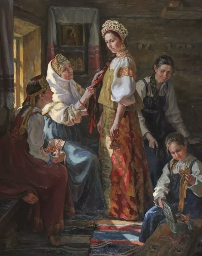 А что наша невеста? Скачет от нетерпения, считает дни до свадьбы? Сколько их осталось? Чаще всего от окончательного сговора и рукобитья до свадьбы оставалось недели две - месяц. Родня за это время готовила угощения на стол: резали скот, пекли хлеба, варили квас. Заготавливали массу атрибутов праздника. Приглашали гостей: то прям всей компанией разъезжая, то узким кругом обходя дома. А невеста... плакала. Аж с самого утра садилась на лавку и заводила причитания. Кому-то помощь требовалась, но чаще и сами справлялись. Плакались о том, как не хочется родных своих покидать и уходить жить в новый дом. Даже если жених был крепко любим и семья близко знакома - всё равно полагалось причитать. Дескать, лучше сейчас все слёзы выплакать, чем в замужестве. Жених, между тем, мог заезжать к своей суженой. Захватит гостинцев-угощений, соберёт холостых друзей - и к ней “здороваться”. А девушка уж ждёт его, все подружки при ней (могли даже жить сутками напролёт), так что скучно не будет! Если часто езд