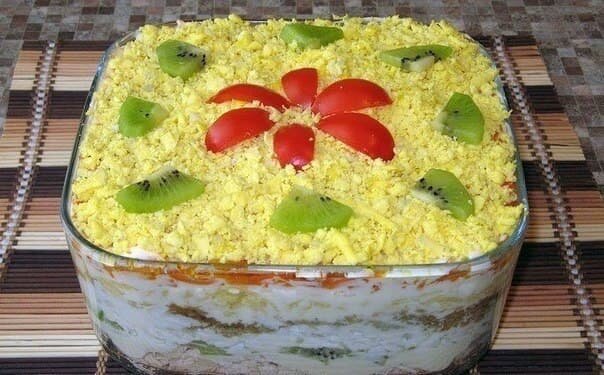Ингредиенты: Куриное филе – 1/2 шт Киви – 1 шт Яичный белок – 3 шт Яичный желток – 3 шт Яблоко – 1 шт Сыр – 150 гр Корейская морковь – 100 гр Майонез Соль, перец Рецепт приготовления салат из курицы с корейской морковью и киви: Все продукты выкладываем слоями в следующем порядке. 1 слой – половинка куриного филе, которое нужно заранее отварить, мелко порезать, посолить и поперчить. 2 слой – один крупный киви – порезать полукольцами. 3 слой – тертые на терке белки 3 яиц. 4 слой – тертое на терке яблоко. 5 слой – 150 гр сыра, тоже потереть на терке. 6 слой – корейская морковь, порезанная на мелкие кусочки. 7 слой – оставшиеся желтки, перетертые на мелкую терку. Все слои промазываем майонезом.Приятного аппетита!
