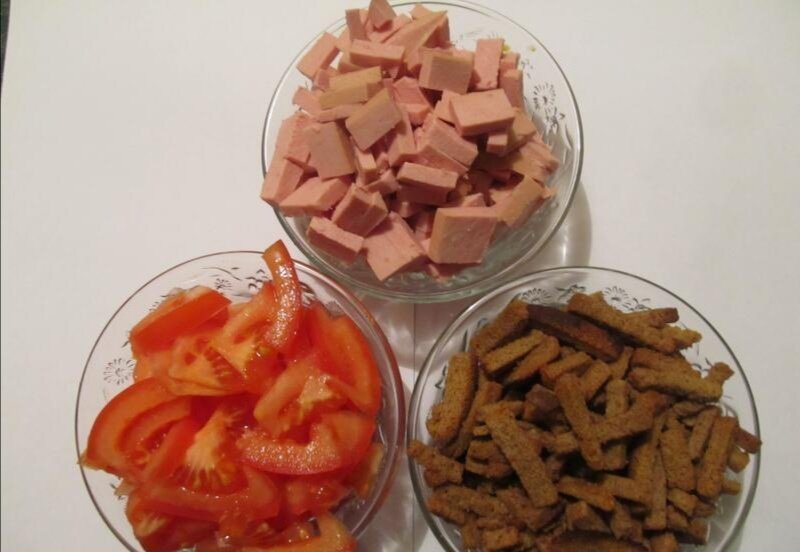 Здравствуйте, мои подписчики. Этот рецепт очень нравится моим детям. И ваши наверняка полюбят. Вареную колбасу я нарезала на брусочки. Мне захотелось поджарить ее на сковороде, но и без этого салат будет вкусным. Колбасу нужно поджарить до румяной корочки и пусть она постоит сторонке. Я займусь другими продуктами. Нарезаю помидоры, форма может быть произвольной. Смешиваю в миске для салата помидор и остывшую колбасу, и консервированную кукурузу. Хорошо перемешиваю продукты и заправляю салат майонезом. Теперь осталось только подать его к столу. Где же сухари. Нет, я не забыла про сухарики. Сухари можно добавлять в последнюю очередь и лучше делать это перед подачей к столу, чтобы они не сильно размякли и приятно пахрустели во рту. Их можно посыпать сверху салата, а если не любите их, можно подать салат без них. Будет также вкусно. Кстати, сухарики можно приготовить как дома самостоятельно из хлеба так и купить готовый продукт магазине. Вот такой салат нравится моим детя