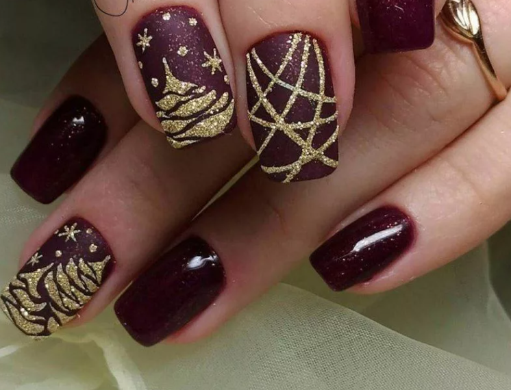 Новогодний дизайн ногтей Бордовый зимний маникюр