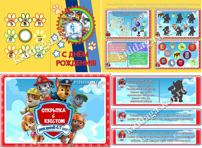 Если ваш ребенок обожает героев мультфильма "Щенячий патруль", то открытка с квестом в "щенячьем" стиле - идеальный способ подарить подарок. Открытку с квестом надо распечатать дома или в салоне печати, обязательно в цвете. Открытка очень яркая и красивая. А в центре, среди команды героев- спасателей, место для фото именинника. Итак, мы узнаём, что компания котов-хулиганов спрятала подарок. Но отчаиваться не стоит - ведь команда Щенячьего патруля всегда готова прийти на помощь. Ответы на несложные задания приводят нас к тайникам. Ах, да - заданий всего 4 и тайников, соответственно, тоже. Это окно, стул, шкаф и дверь. В тайниках подсказки от патруля. А сами задания в открытке. Подготовка к квесту не займёт более 10 минут. Стоимость открытки с квестом "Щенячий патруль": 100 рублей. Подробнее об открытке с квестом для малышей в стиле "Щенячий патруль" читайте на нашем сайте: https://printkwest.ru/otkrytka-s-kwestom-shchenyachij-patrul/ У нас самые демократичные цены на готовые сцен