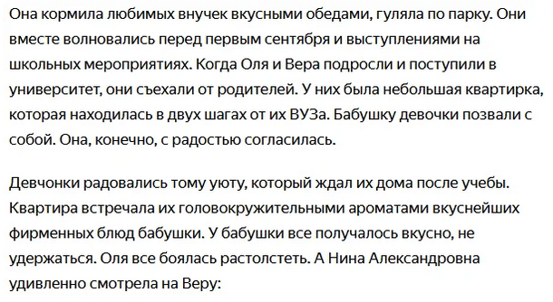 Нина Александровна была полностью довольна своей жизнью. Она воспитала трёх замечательных детей. Со старшим, Серёжей, она и жила. Более того, женщина была счастливой бабушкой девочек-близняшек. И сейчас её основной миссией было воспитание девочек, поскольку мама с папой много работали для обеспечения семьи.