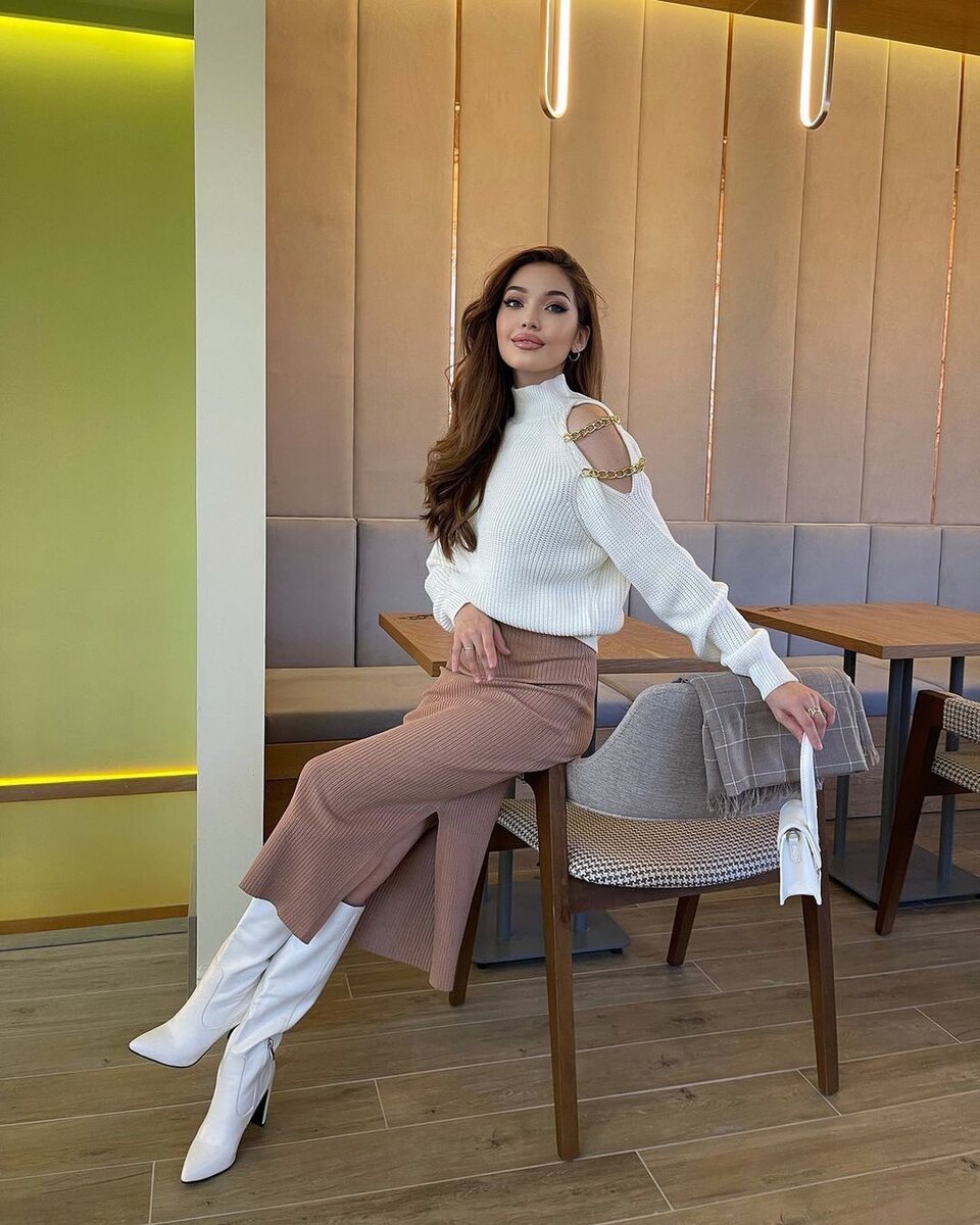 Белый - один из самых универсальных цветов, с которым можно составить множество образов. Несмотря на это, многие избегают его в своих нарядах и в крайнем случае ограничиваются белой блузой или рубашкой. Но стоит обратить свое внимание на другие белые предметы гардероба, которые при правильном выборе подойдут любой женщине. Сегодня мы хотим продемонстрировать замечательные образы с трикотажем в белых цветах. Они будут прекрасным украшением ваших теплых зимних образов. Удачными являются ансамбли, в которых белый трикотажный свитер дополняется юбкой миди прямой или плиссированной, кожаными брюками или классическими. В холодное время года можно выбрать модели с высоким воротником. Они идеально защитят ваше горло. С такими свитерами также не нужно носить шарфы. Смотрите, как гармонично сочетается бежевое пальто поверх белого мягкого свитера. Мне очень нравится. Белый свитер с вырезом на плече - красиво, соблазнительно, но не вульгарно! Теплые кардиганы со своеобразными акцентами, как пайет