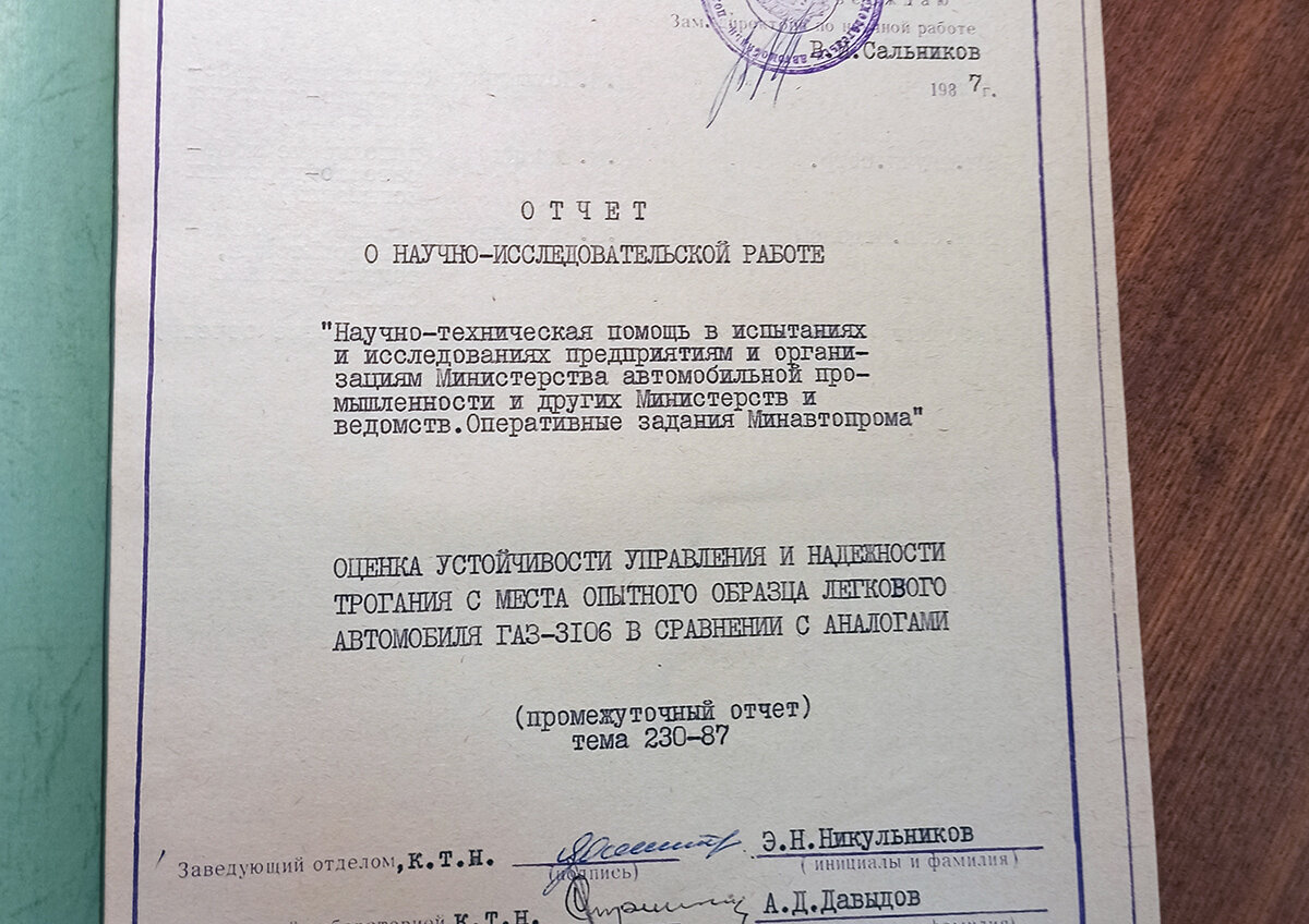 А какой все же мотор стоял на ГАЗ-3106? Отчет по испытаниям на надежность управления ответа на этот вопрос не давал, поскольку там тема двигателя не затрагивалась вообще. Однако у нас в архиве уже лет десять лежит пара документов 1986 и 1987 года за подписью главного конструктора ГАЗа, где упоминается весь ассортимент серийных моделей и модификаций этого периода времени, а также даются краткие сведения относительно стадии работ над опытными машинами. Так в отношении "макетного образца ГАЗ-3106" там черным по белому указано, что машина оснащена двигателем ЗМЗ-406.10 со впрыском топлива. Таким образом, технически ГАЗ-3106 полностью соответствовал "демократичной" модификации новой "Волги" - ГАЗ-3104.