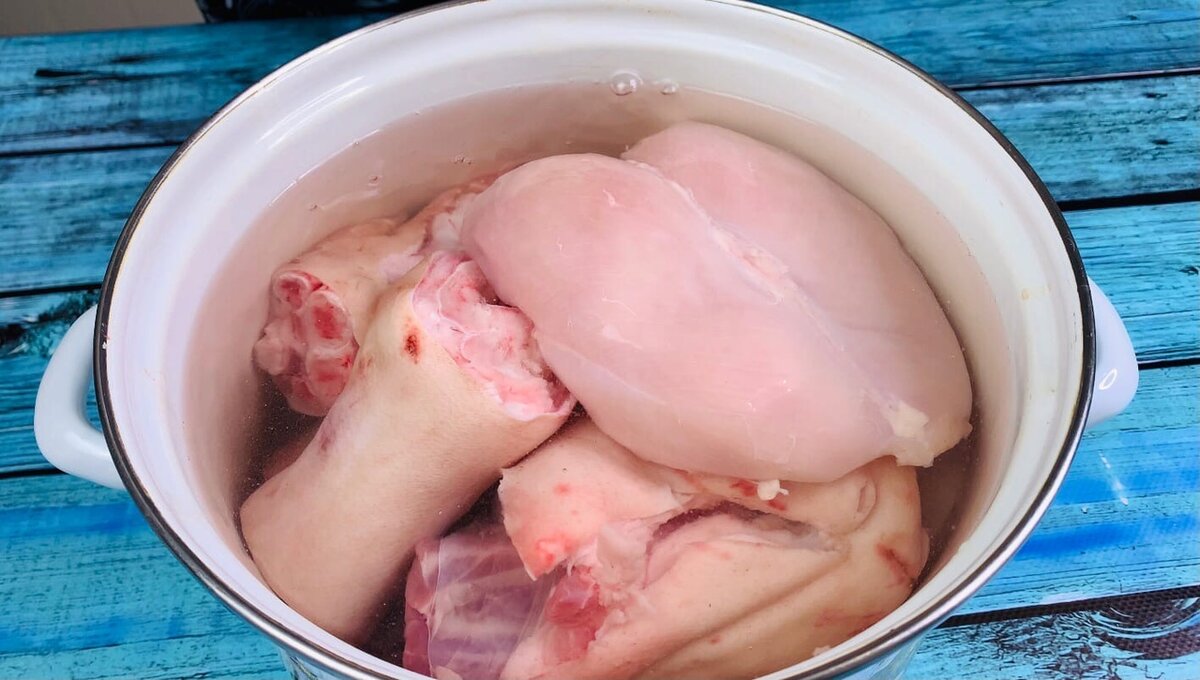 1. В кастрюлю укладываем свиную рульку, ножки и куриное филе.