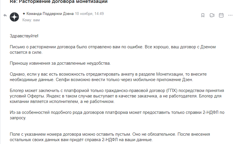После внезапной суеты со стороны странненьких и зело тупеньких сотрудников Яндекс.Дзена с требованиями предоставить селфи с паспортом в руках в знак нерушимости ГПХ о монетизации (иначе расторжение и так недействующего договора), и моей последующей переписки, где я ничтоже сумняшеся прошу выслать мне обещанные документы о расторжении, мне пришел вот такой удивительный ответ: Это какой-то договор Шрёдингера: вроде он есть, но судя по действующей пессимизации канала, его де факто нет: Жду номер своего "ГПХ монетизации", чтобы разобраться далее. Иначе какая-то подозрительная картина получается -- фактически нас ничего не связывает. Зачем вам мои фотографии?