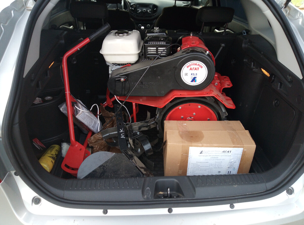 Родители у меня решили приобрести себе в деревню мотоблок, чтобы культивировать огород и остро встал вопрос как им его привезти после покупки. Обратились ко мне, у меня Веста на вариаторе и на ней настоятельно не рекомендуется буксировать прицеп, так что этот вариант отпал, но Веста у меня в кузове универсал, да это та которая "красивая", и я решил, что она справится с перевозкой мотоблока. После долгих поисков, выборов вариантов мотоблока и производителей, изначально остановились на мотоблоке "Нева", отзывы о нем не плохие, да и в салон Весты со снятыми колесами и сложенным задним сиденьем он должен был зайти. А вот когда приехал в магазин чтобы посмотреть его в "живую", мне продавец, пораспрашивав для чего нужен мотоблок посоветовал обратить внимание на мотоблок "Агат", сначала он мне показался совсем не солидным и каким то не обычным, в нашей деревне я таких и не видел. Но цена на него была на порядок ниже чем на "Неву". А посмотрев на него обзоры выбор уже сделал в его пользу, т