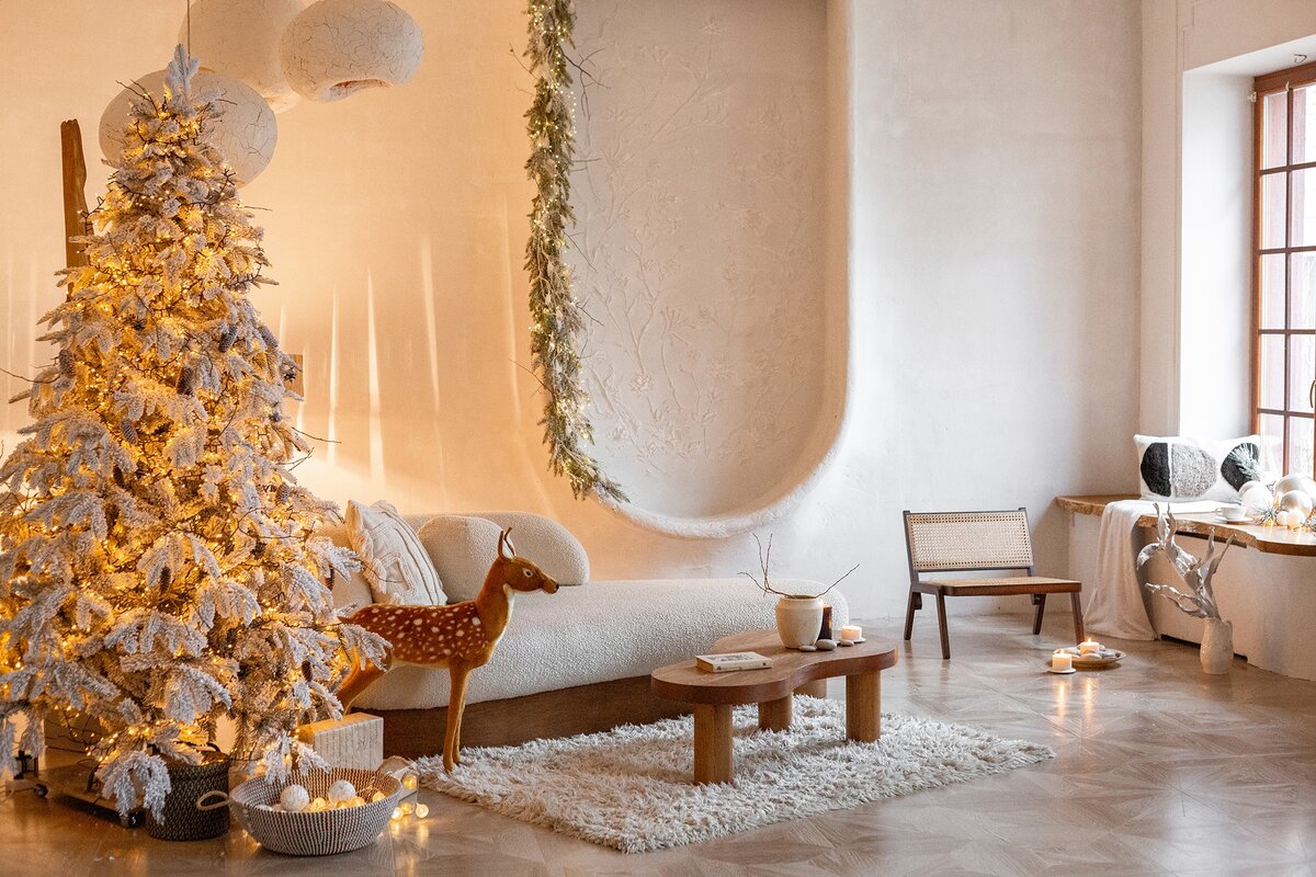 Студия «Рояль» в этом году удивила интерьером. Здесь точно получится что-то свеженькое, на фото немного похожее на кафе, немного на загородный дом. Детали – елка, плетеные домики, деревянная посуда, мягкие игрушки и сияющие звезды на окнах.