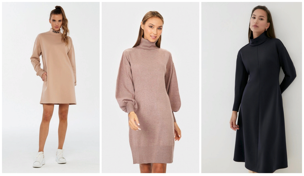 В этом году большую популярность обрели платья-толстовки и трикотажные платья свободного кроя. Что не стоит покупать, так это обтягивающие модели. По двум причинам: во-первых, это сейчас не в моде, во-вторых, зимой более свободная одежда всегда лучше согревает. А при необходимости вы можете добавить под платье водолазку, чтобы уж наверняка не замерзать.