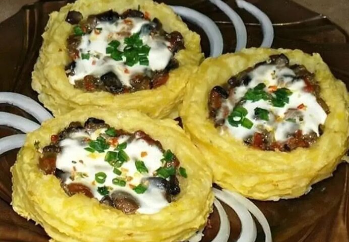 - Готовые картофельные гнезда с грибами переложить на блюдо, при желании присыпать зеленью.