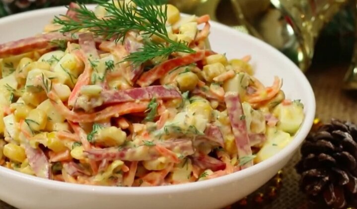 - В глубокой миске собрать салат: положить нарезанную колбасу, морковку по-корейски, измельченные вареные яйца, кукурузу и мелко нарезанный свежий укроп. Добавить майонез, хорошо перемешать. Салат готов!