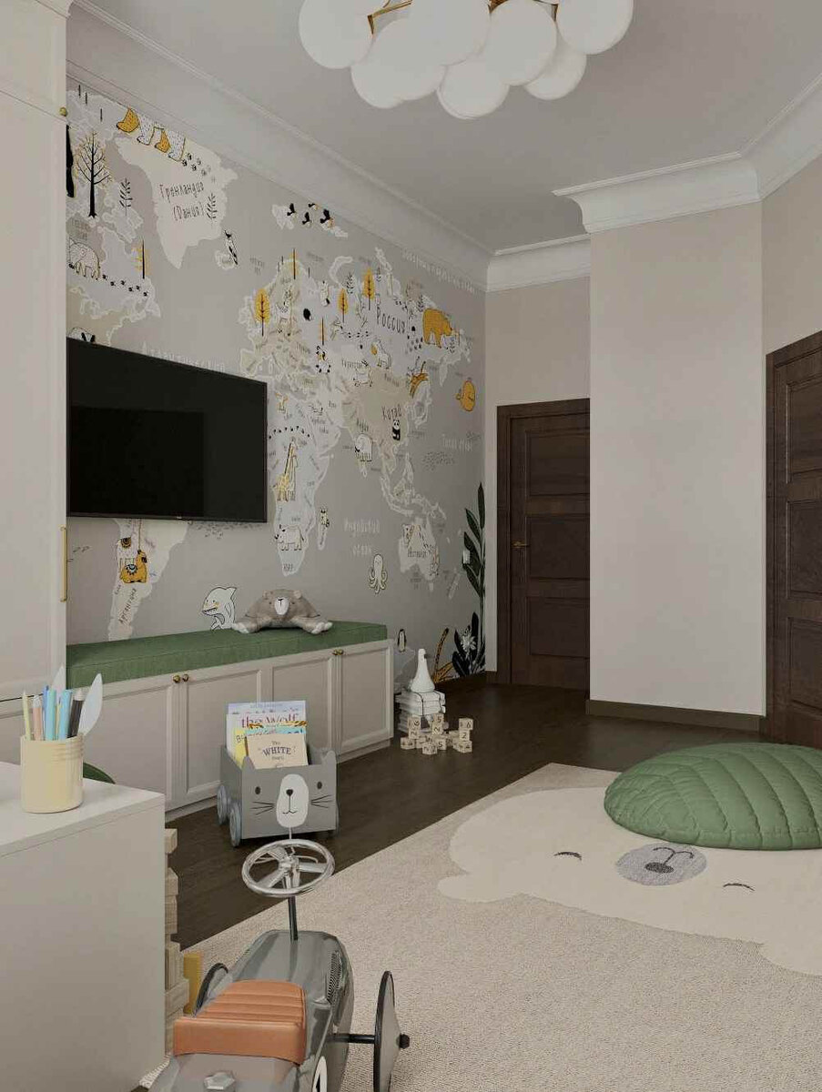 Современная детская для мальчика 3-10 лет - интерьер детской в серо-бежевых тонах. Мебельная фабрика Mamka позаботится о том, чтобы детская мебель была функциональной и стильной. Фото на сайте Детская комната для маленького мальчика выполнена в нейтрально сером цвете, с которым гармонично сочетается белая и зеленая мебель. Правая стена от входа оклеена эксклюзивными обоями, на которых изображена детская карта мира. Желтым цветом выделены деревья и животные, обитающие на разных континентах. В центре комнаты большой ковер с белым мишкой на сером фоне. В левом углу у окна установлена большая детская кровать с мягким бортиком. Дизайнерская мебель изготовлена из дерева и обита зеленым текстилем. Над кроватью картина с 2 круглыми бра. В правом углу у окна оригинальная мебель для детской комнаты, выполненная в виде углового стеллажа со столешницей и тумбой с мягким сиденьем зеленого цвета. Фасады стеллажа с открытыми полками и распашными дверцами окрашены в белый цвет. Мебель для мальчика раз