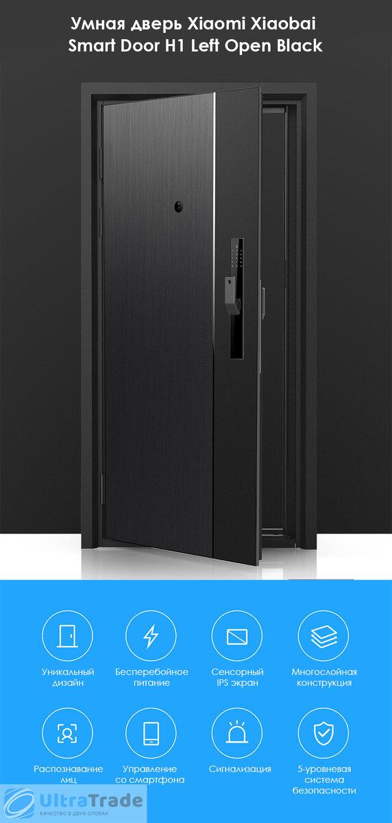 Умная дверь Xiaomi Xiaobai Smart Door H1 – это лучший способ обезопасить себя и свое имущество. Данная модель поставляется с целым комплексом умных аксессуаров, включая умный дверной замок, встроенный дисплей, систему наблюдения и многое другое. Таким образом ваш дом будет в полной безопасности при любой погоде и в любое время суток. 5 способов отпирания замка Для отпирания замка используется швейцарский дактилоскопический датчик отпечатков пальцев с коэффициентом распознавания – 99.7%. Датчик обеспечит надежную защиту от ложных срабатываний и эффективно считывает отпечатки даже мокрых рук. Помимо отпечатка пальцев, замок поддерживает еще 4 способа отпирания двери, среди которых: фиксированный пароль, динамический пароль, отпирание с помощью смартфона по Bluetooth, ключ. Также имеется дополнительная функция распознавания лиц по базе данных, которая открывается при покупке облачного хранилища. 10-дюймовый экран Дверь производится из холоднокатаной и нержавеющей стали со специальным звук