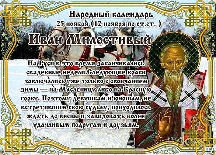 *** 25 ноября - Иван Милостивый Другое его название – Иван Снежный было получено по причине частых снегопадов. Верующие православной церкви в этот день чтут память святого Иоанна Милостивого, патриарха Александрийского. Свое прозвище он приобрел в результате пересчета всех нищих в Александрии (более 7000 человек) и оказания им помощи. Каждый день им давалась бесплатная еда. Дважды в неделю он сам раздавал милостыню и принимал нуждающихся, а трижды в неделю оказывал помощь больным в больницах. Иоанн родился в VI веке в семье князя Епифания на Кипре. Став юношей, женился, и жена родила ему детей. Однако после их смерти он решил всецело посвятить себя Богу и принять иночество. Иоанн вел строгий пост и постоянно молился. Спустя несколько лет он стал патриархом в Александрии. За годы своего служения запомнился своими благодеяниями и милостыней. Он всегда исполнял просьбы просящих и был кроток к людям. Решив оставить патриаршую кафедру по причине болезни, Иоанн отправился на Кип